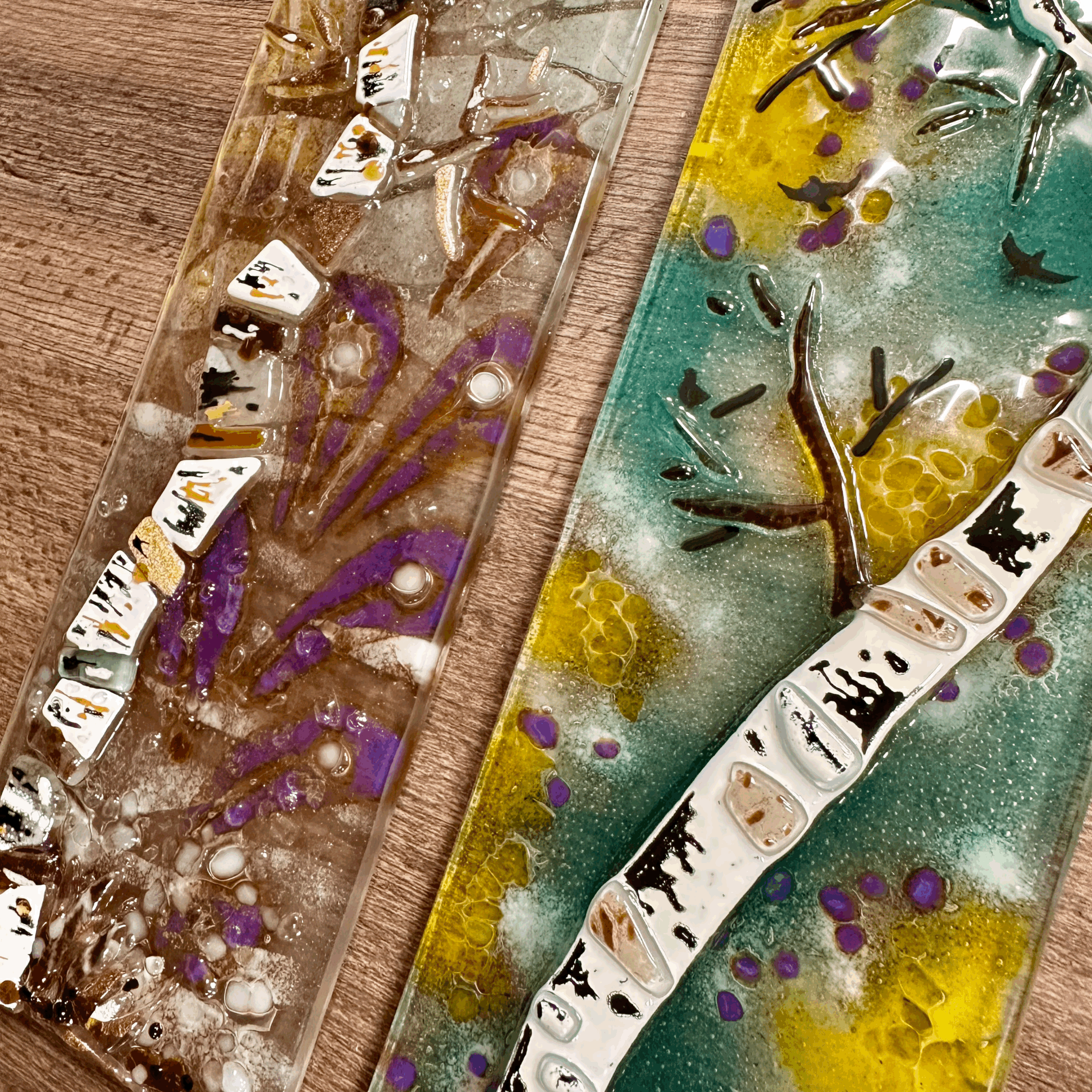 Techniques: We’ll use various techniques depending on the class. Including fusing, slumping, and embossing. We’ll be using recycled window glass, along with various pre-colored and pre-fired glass pieces, small colored glass pieces, embossing paper and glass powders.